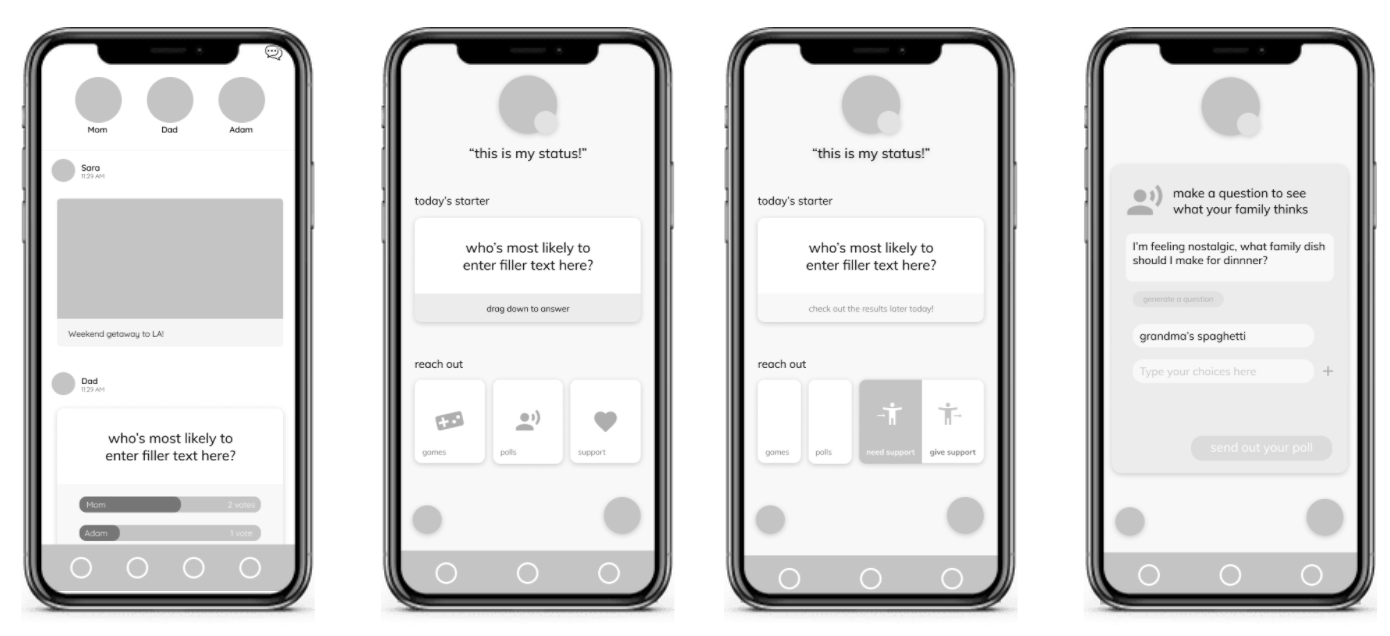 From the insights gathered, it is evident that it is important for families to stay connected to have a healthy dynamic. Keeping the entire family in mind, we created four mindsets that would reflect the different types of family members. We then used these mindsets and personas while designing to ensure that each family member would be satisfied with our product.