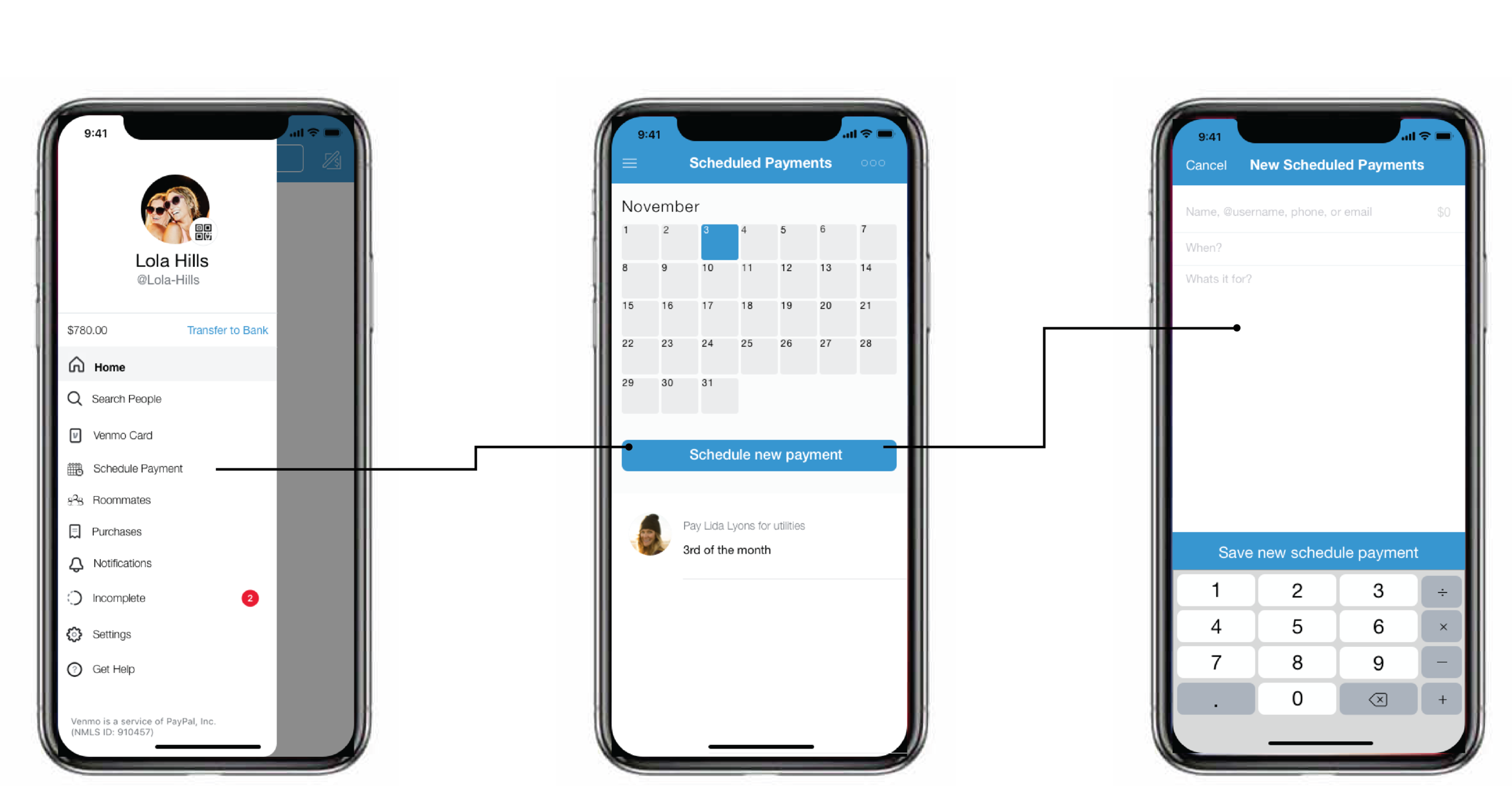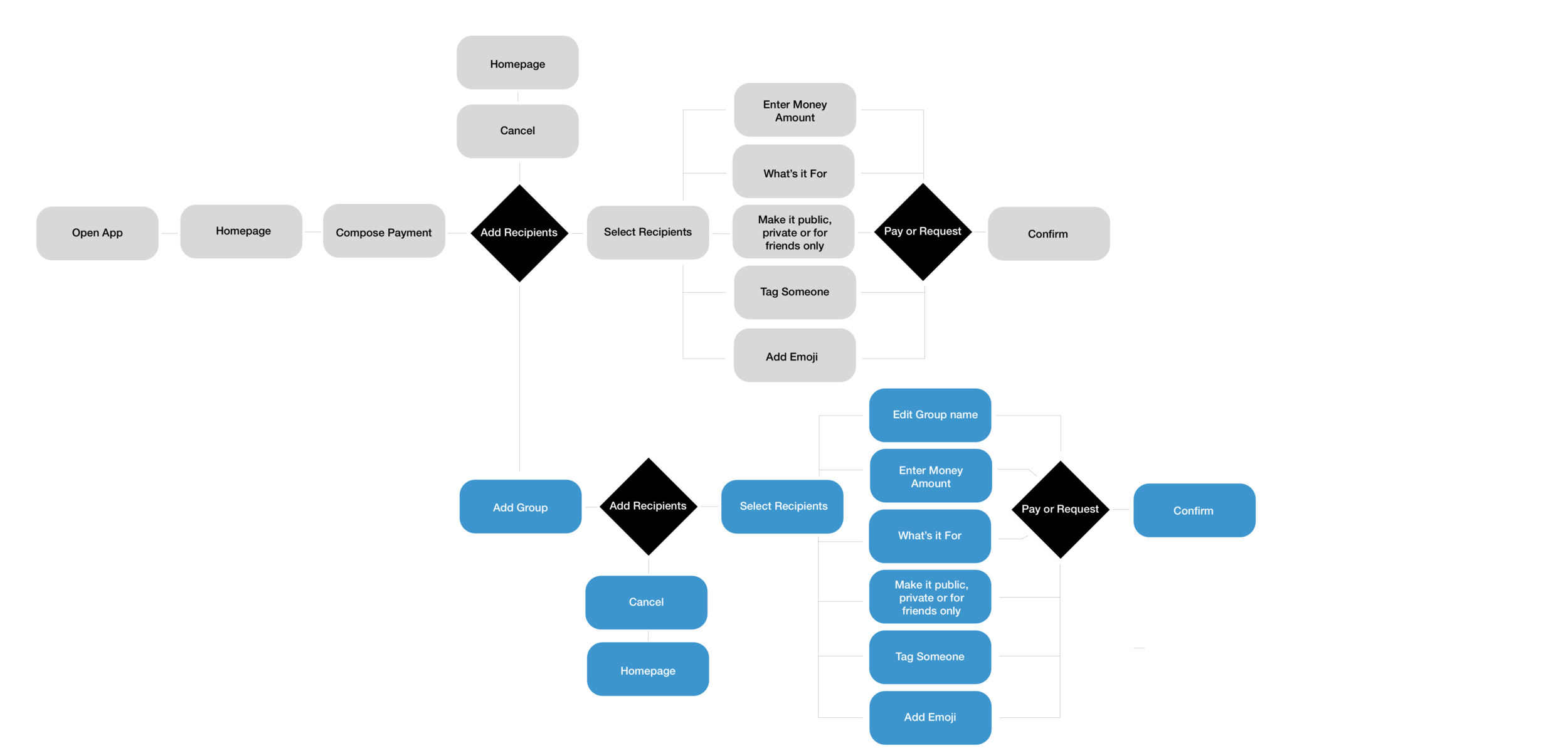 For my Information Architecture Class, I was asked to choose an existing company and either redesign their interface or to add new features. I chose to add new features to the existing company, Venmo. The features I added to Venmo are being able to create group payments and schedule payments.