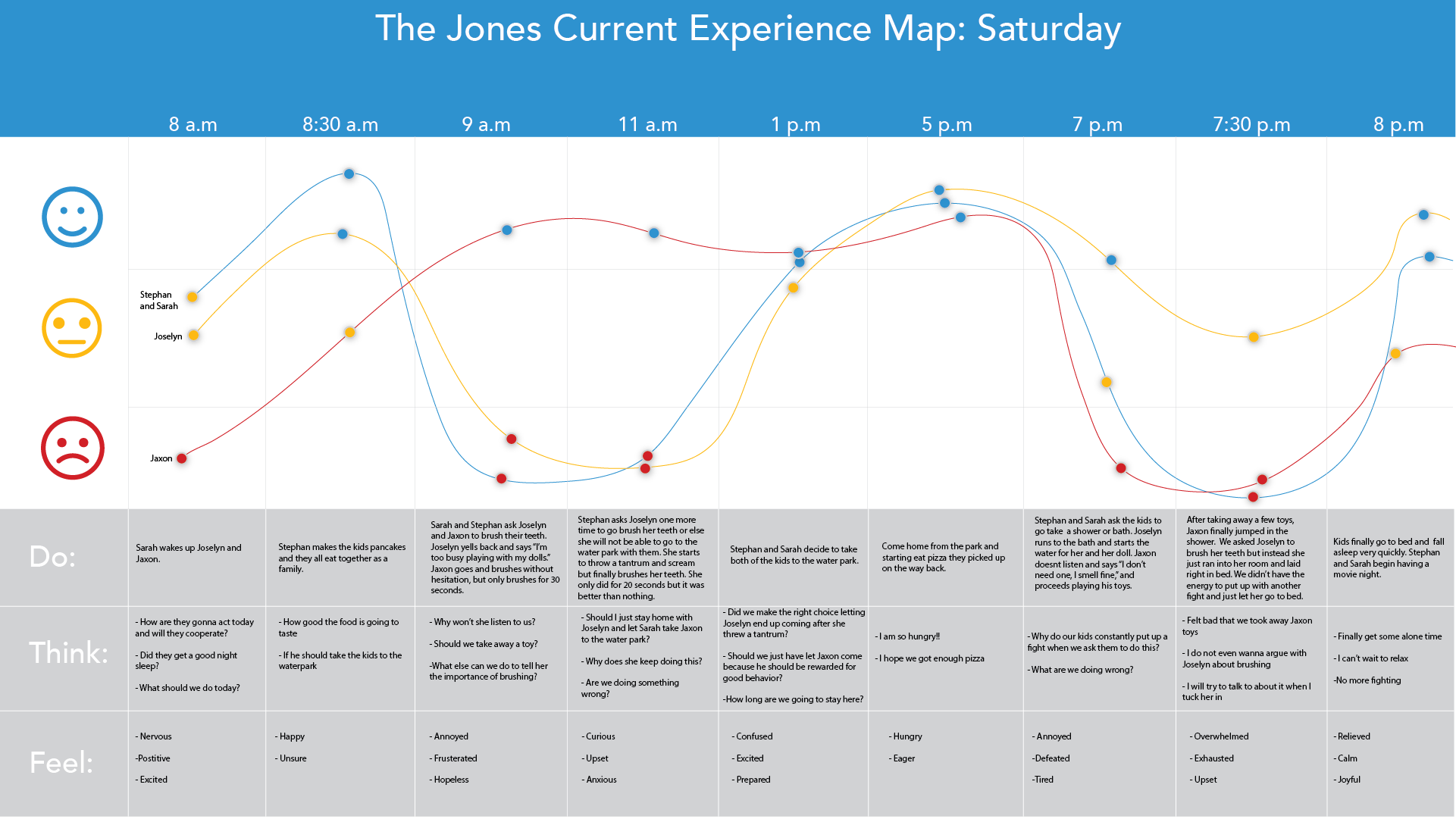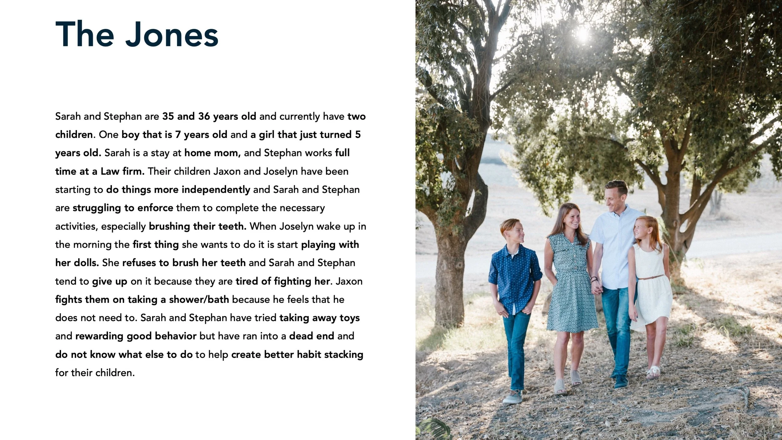 From the insights gathered, it is evident that parents are having a difficult time getting their children to complete everyday hygiene tasks. However, when parents do implement routines they notice that their children become more cooperative. From this information, I created a persona that resembled a family of four. Both of their children struggle with completing different hygiene activities.